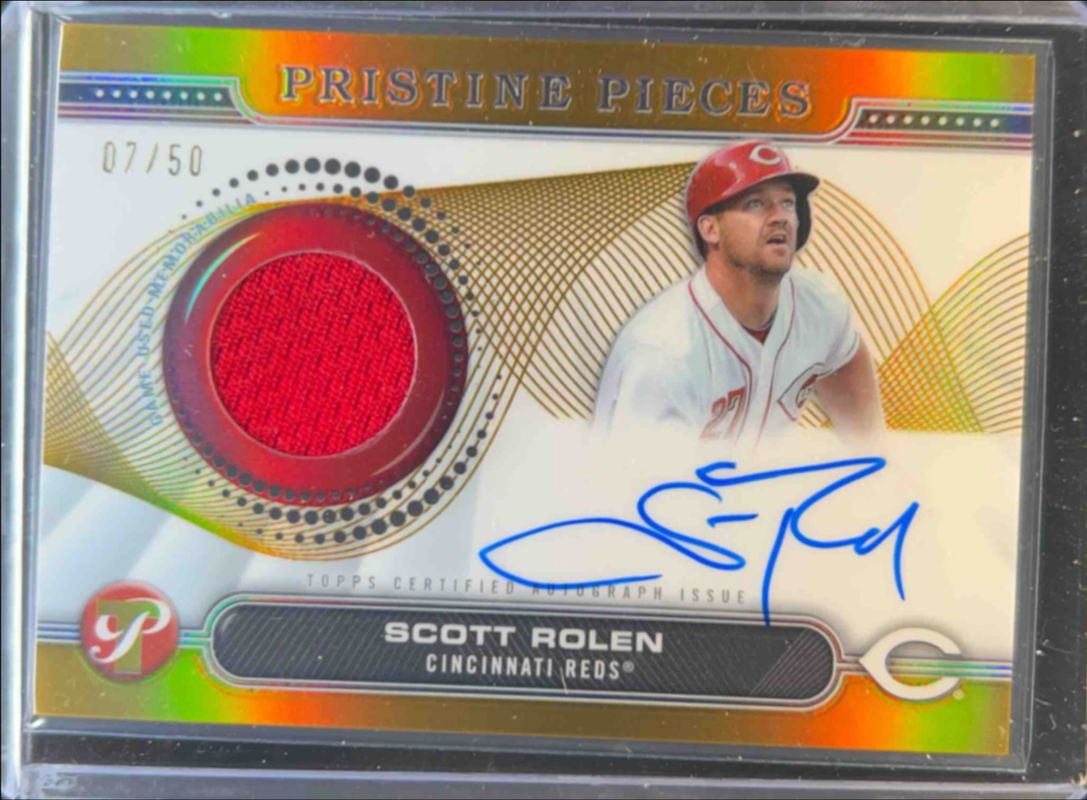 The Scott Rolen 2024 Topps Pristine #PPAR-SR Pristine Pieces Autographs Relics - Gold Refractor /50 card is 1 of 6 Scott Rolen's card variations in the 2024 Topps Pristine set being tracked by Sports Card Investor, including Pristine Pieces Autographs Relics, Pristine Pieces Autographs Relics - Pristine Refractor /99, Pristine Pieces Autographs Relics - Orange Refractor /25, Pristine Pieces Autographs Relics - Red Refractor /5, and Pristine Pieces Autographs Relics - Superfractor /1.