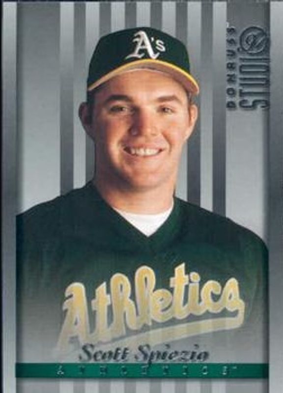 The Scott Spiezio 1997 Donruss Studio #148 Base card is 1 of 3 Scott Spiezio's card variations in the 1997 Donruss Studio set being tracked by Sports Card Investor, including Press Proof Gold, and Press Proof Silver.