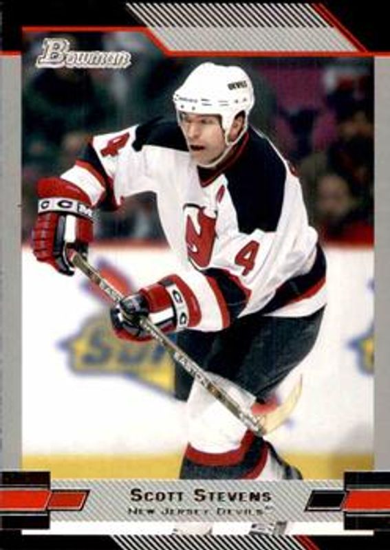 The Scott Stevens 2003 Bowman Draft Picks & Prospects #79 Base card is 1 of 6 Scott Stevens' card variations in the 2003 Bowman Draft Picks & Prospects set being tracked by Sports Card Investor, including Gold, Chrome Refractor /300, Chrome /250, Chrome X-Fractor /150, and Chrome Gold Refractor /50.