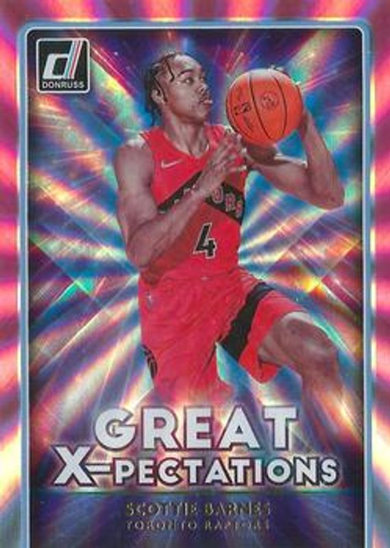 The Scottie Barnes 2021 Donruss #22 Great X pectations - Holo Pink Laser Rookie card is 1 of 68 Scottie Barnes' card variations in the 2021 Donruss set being tracked by Sports Card Investor, including Base, Choice, Green Ice, Green Laser, and Green & Yellow Laser.
