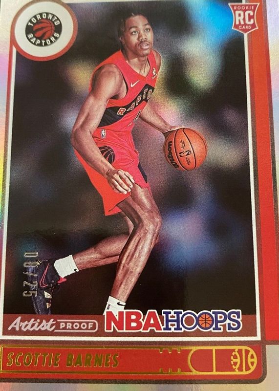 The Scottie Barnes 2021 Hoops #227 Artist Proof /25 Rookie card in Raw condition has not changed in price in the last 30 days and was last sold for $190.00 .