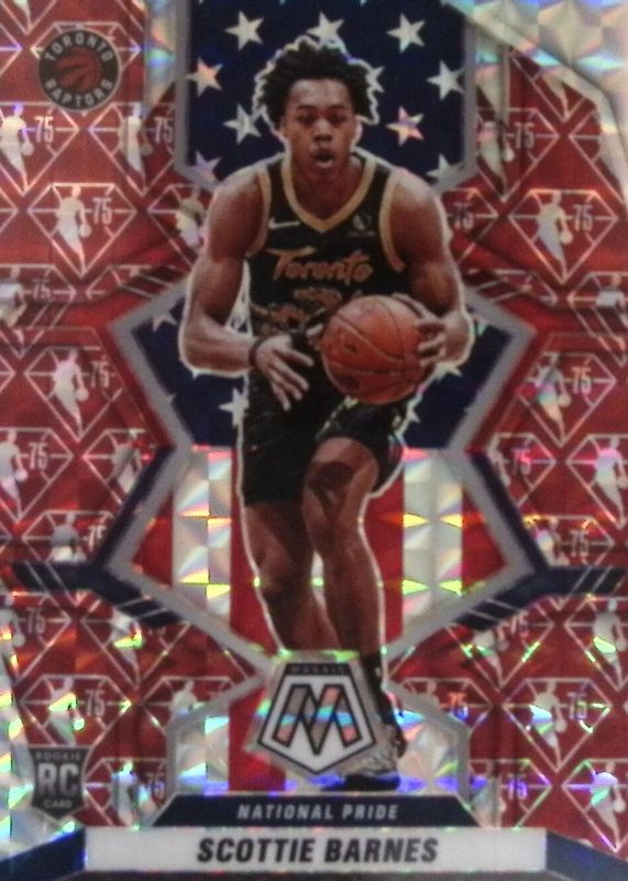 The Scottie Barnes 2021 Mosaic #257 National Pride - NBA 75th Anniversary Rookie card in Raw condition has not changed in price in the last 30 days and was last sold for $51.00 .