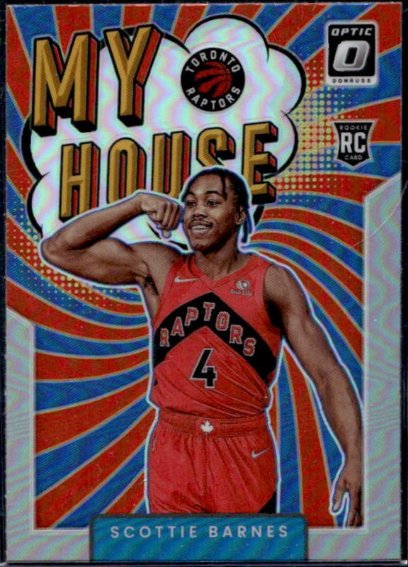 The Scottie Barnes 2021 Optic #19 My House - Holo Rookie card is 1 of 105 Scottie Barnes' card variations in the 2021 Optic set being tracked by Sports Card Investor, including Base, Blue Pulsar, Blue Velocity, Checkerboard, and Choice.