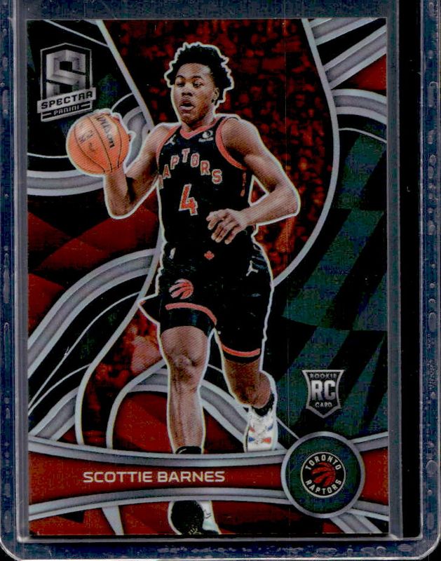 The Scottie Barnes 2021 Spectra #110b Silver Rookie card is 1 of 76 Scottie Barnes' card variations in the 2021 Spectra set being tracked by Sports Card Investor, including #110 Base, #110b Base, #177 Base, #110b 75th Anniversary, and #177 75th Anniversary.