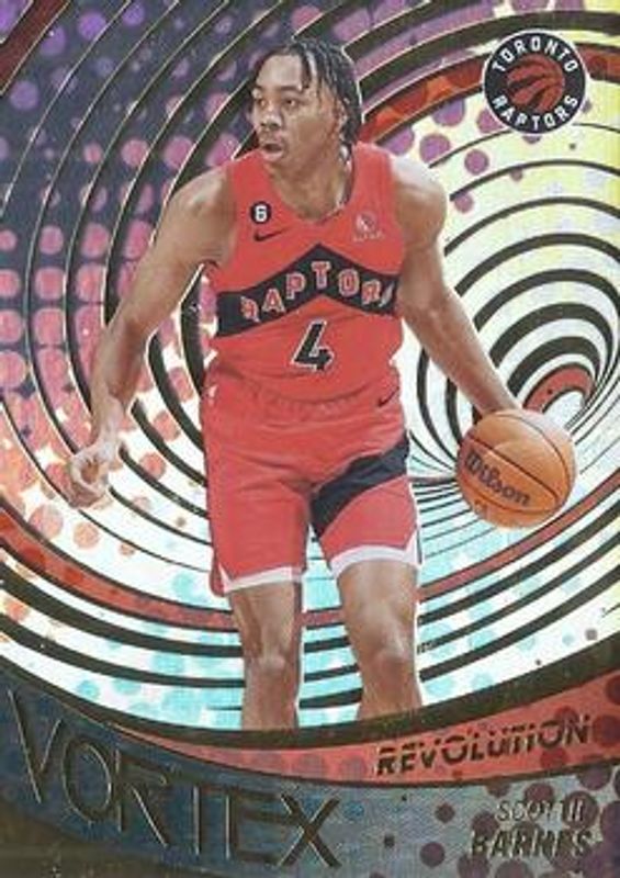 The Scottie Barnes 2022 Revolution #8 Vortex card is 1 of 26 Scottie Barnes' card variations in the 2022 Revolution set being tracked by Sports Card Investor, including Base, Asia Red, Astro, Chinese New Year, and Fractal.