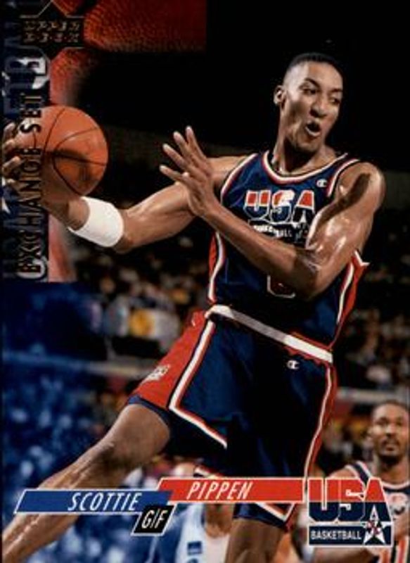 The Scottie Pippen 1993 Upper Deck Special Edition #USA9 USA Basketball Exchange card is 1 of 7 Scottie Pippen's card variations in the 1993 Upper Deck Special Edition set being tracked by Sports Card Investor, including Base, Electric Court, Electric Court Gold, Behind the Glass, and Die-Cut All-Stars - Eastern Conference.