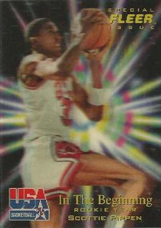 The Scottie Pippen 1996 Fleer USA #7 Base card is 1 of 6 Scottie Pippen's card variations in the 1996 Fleer USA set being tracked by Sports Card Investor, including #17 Base, #27 Base, #37 Base, #47 Base, and #7 Heroes.