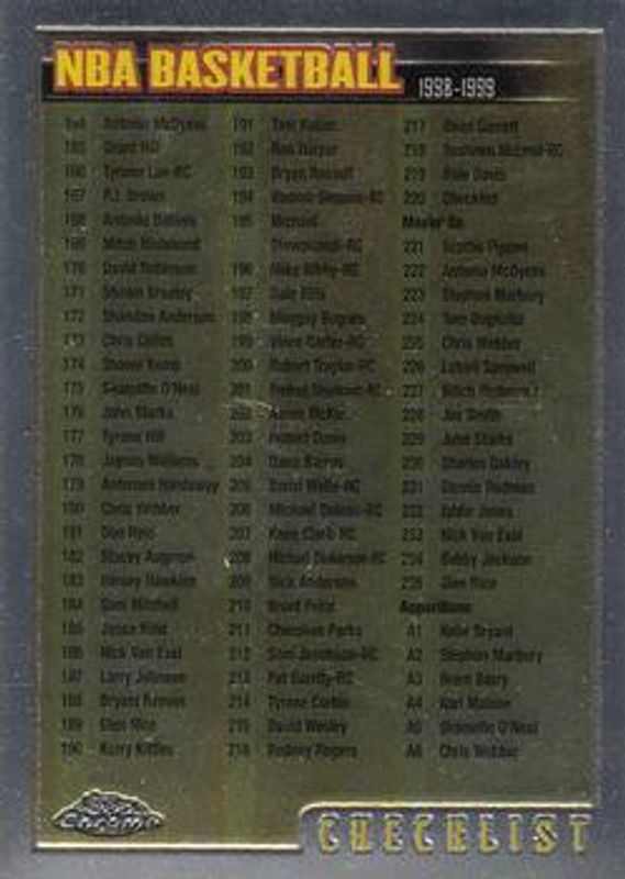 Other popular players in the 1998 Topps Chrome set include Tyrone Corbin, Steve Smith (NBA), Chris Gatling, Hubert Davis, and Jacque Vaughn.