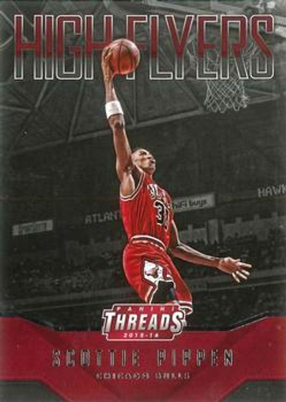 The Scottie Pippen 2015 Threads #9 High Flyers card is 1 of 8 Scottie Pippen's card variations in the 2015 Threads set being tracked by Sports Card Investor, including Century Greats Threads /199, High Flyers - Century Proof Red /99, Century Collection - Materials /75, High Flyers - Century Proof Gold /25, and Century Collection Materials - Prime /10.