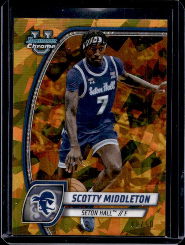 The Scotty Middleton 2024 Bowman Chrome University Sapphire Edition #94 Gold Refractor /50 card is 1 of 18 Scotty Middleton's card variations in the 2024 Bowman Chrome University Sapphire Edition set being tracked by Sports Card Investor, including Base, Purple Refractor /100, Yellow Refractor /75, Green Refractor /65, and Orange Refractor /25.
