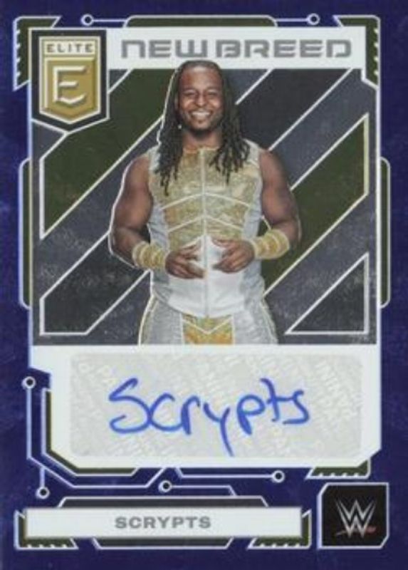 The Scrypts 2023 Elite WWE #NB-SCR New Breed Autographs - Blue /25 card is 1 of 9 Scrypts' card variations in the 2023 Elite WWE set being tracked by Sports Card Investor, including Elite Impressions, New Breed Autographs, New Breed Autographs - Green, New Breed Autographs - Red /49, and Elite Impressions - Gold /10.