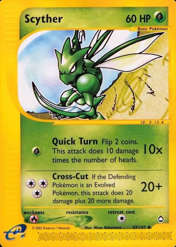 The Scyther 2003 Aquapolis #057/147 Base card in Raw TCG (Near Mint) condition has not changed in price in the last 30 days and was last sold for $12.36 .