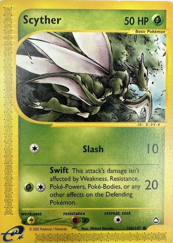 The Scyther 2003 Aquapolis #106/147 Base card in Raw TCG (Near Mint) condition has moved down -$12.04 (-63.5%) in the last 30 days and was last sold for $6.91 .