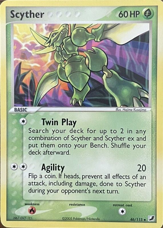 The Scyther 2005 EX: Unseen Forces #046/115 Base card in Raw TCG (Near Mint) condition has moved down -$3.78 (-52.7%) in the last 30 days and was last sold for $3.39 .