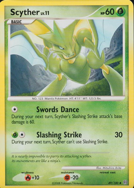 The Scyther 2008 Diamond & Pearl: Stormfront #049/100 Base card in Raw TCG (Lightly Played) condition has moved up $2.01 (+67.2%) in the last 30 days and was last sold for $5.00 .