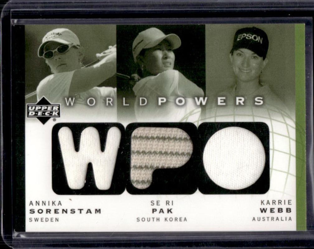 The Se Ri Pak 2003 Upper Deck #WP3-AS/SP/KW World Powers Triple Shirts card is 1 of 7 Se Ri Pak's card variations in the 2003 Upper Deck set being tracked by Sports Card Investor, including #49 Base, #GP-SP Golf Gear - Par, #MC-30 Major Champions, #MC-29 Major Champions, and #WP2-LD/SP World Powers Double Shirts.