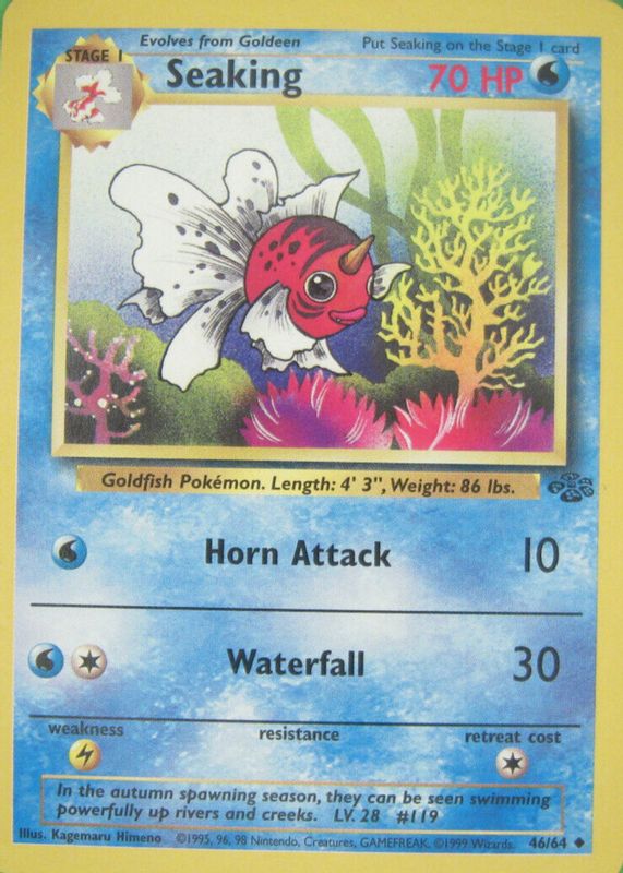 The Seaking 1999 Jungle #46/64 Unlimited card in Raw TCG (Near Mint) condition has moved down -$0.45 (-23.1%) in the last 30 days and was last sold for $1.50 .