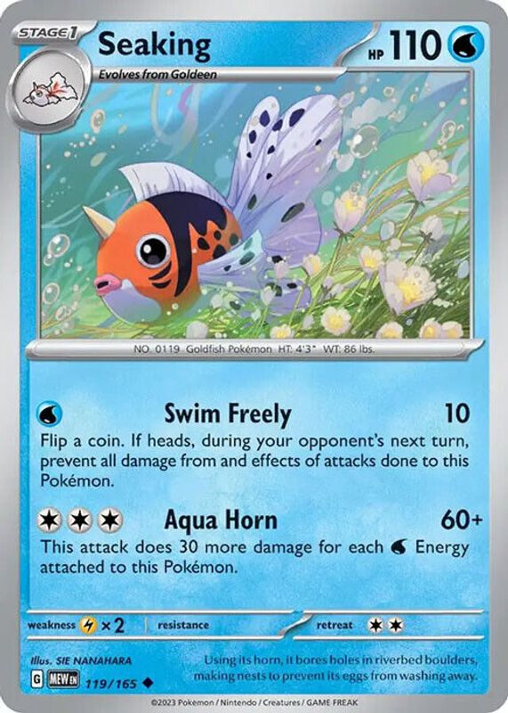 The Seaking 2023 Scarlet & Violet: 151 #119/165 Base card in Raw TCG (Near Mint) condition has moved down -$0.99 (-49.7%) in the last 30 days and was last sold for $1.00 .