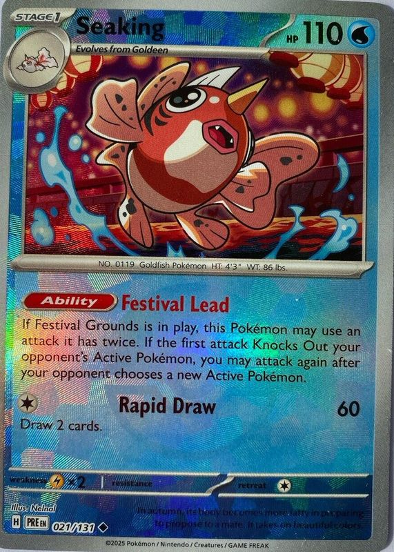 The Seaking 2025 Scarlet & Violet: Prismatic Evolutions #021/131 Poke Ball Reverse Holo card in Raw TCG (Near Mint) condition has not changed in price in the last 30 days and was last sold for $1.49 .