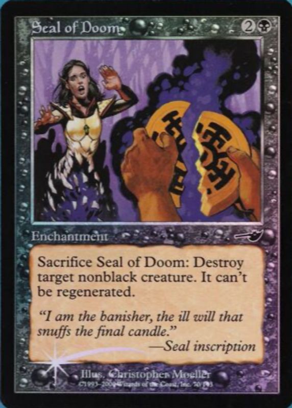 The Seal of Doom 2000 Nemesis #70 Foil card in Raw TCG (Lightly Played) condition has not changed in price in the last 30 days and was last sold for $4.25 .