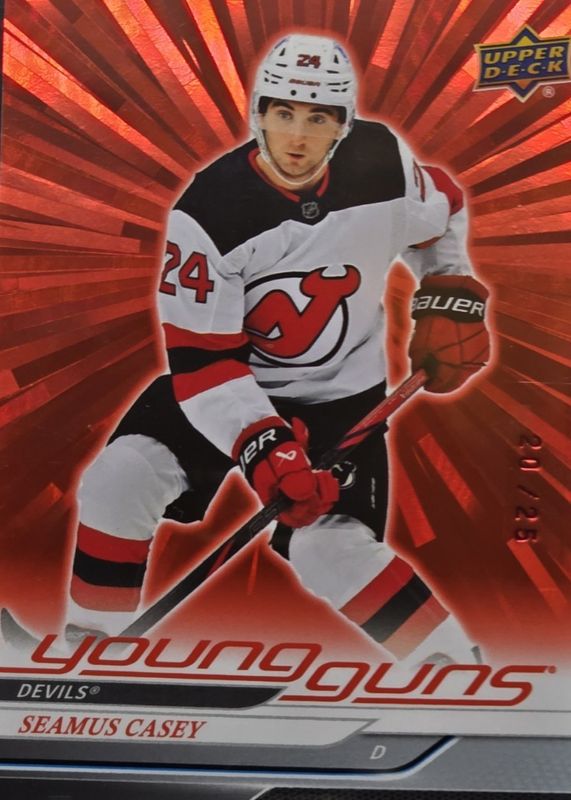 This card is 1 of 8 Seamus Casey's card variations in the 2024 Upper Deck set being tracked by Sports Card Investor, including Young Guns Base, Young Guns - Clear Cut, Young Guns - Outburst Silver, Young Guns - Deluxe /250, and Young Guns - UD Exclusives /100.