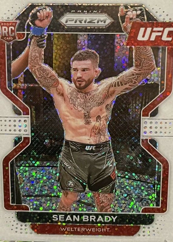 Sean Brady's MMA cards are available in at least 10 sets. Sean Brady's biggest 7-day price movers are 2022 Prizm UFC #162 White Sparkle /(SSP), 2024 Topps Chrome UFC #172 Speckle Refractor /299, and 2024 Topps Chrome UFC #172 Orange Refractor /25.