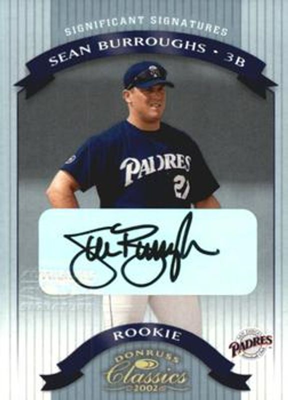 The Sean Burroughs 2002 Donruss Classics #140 Significant Signatures /100 card is 1 of 4 Sean Burroughs' card variations in the 2002 Donruss Classics set being tracked by Sports Card Investor, including Base /1500, Timeless Tributes /100, and Chicago National /5.