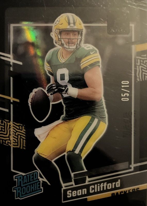This card is 1 of 15 Sean Clifford's card variations in the 2023 Clearly Donruss set being tracked by Sports Card Investor, including Base, Gold, Holo Mosaic, Holo Rated Rookie Logo, and Purple /199.