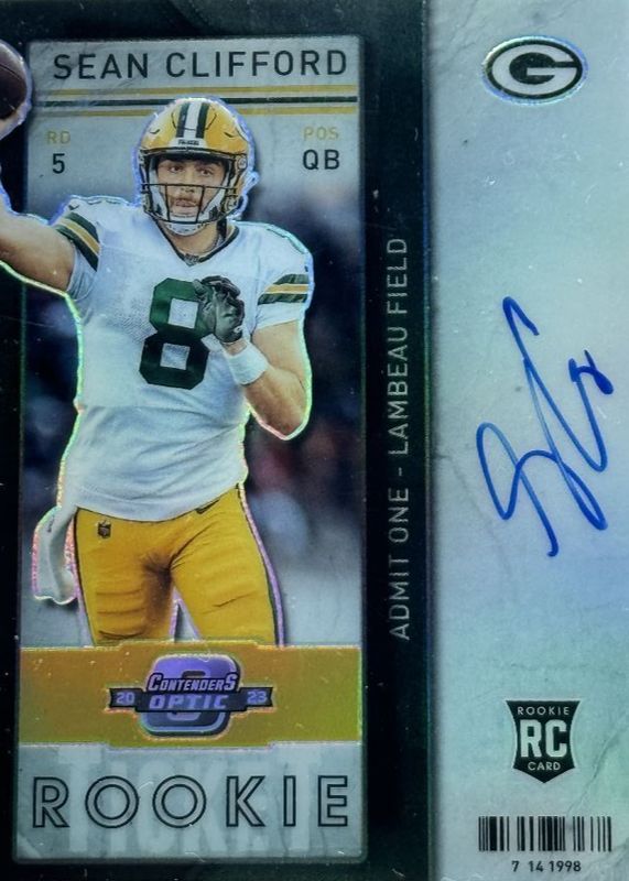 The Sean Clifford 2023 Contenders Optic #13TA-SCD 2013 Contenders Throwback Rookie Autographs /25 card in Raw condition has not changed in price in the last 30 days and was last sold for $17.50 .