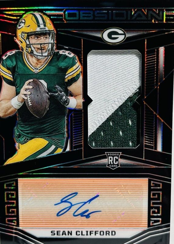 This card is 1 of 10 Sean Clifford's card variations in the 2023 Obsidian set being tracked by Sports Card Investor, including Rookie Jersey Autographs /199, Rookie Jersey Autographs - Electric Etch Purple /75, Rookie Jersey Autographs - Electric Etch Purple Flood /30, Rookie Jersey Autographs - Electric Etch Green /25, and Rookie Jersey Autographs - Electric Etch Yellow /10.