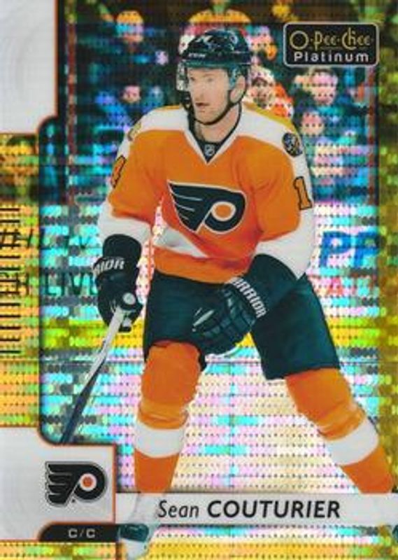 The Sean Couturier 2017 O-Pee-Chee Platinum #116 Seismic Gold /50 card is 1 of 14 Sean Couturier's card variations in the 2017 O-Pee-Chee Platinum set being tracked by Sports Card Investor, including Base, Rainbow, Violet Pixels, Red Prism /199, and Royal Blue Cubes /99.