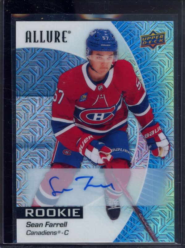 The Sean Farrell 2023 Upper Deck Allure #143 Blue Line Auto /35 Rookie card is 1 of 25 Sean Farrell's card variations in the 2023 Upper Deck Allure set being tracked by Sports Card Investor, including Base, Black Rainbow, Confetti, Hypnosis, and Orange Slice.