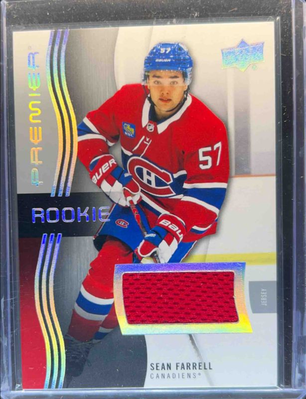 The Sean Farrell 2023 Upper Deck Premier #131 Base Memorabilia - Jersey Rookie card is 1 of 34 Sean Farrell's card variations in the 2023 Upper Deck Premier set being tracked by Sports Card Investor, including Base /399, Bronze /199, Gold /65, Ruby /49, and Rose Gold /25.