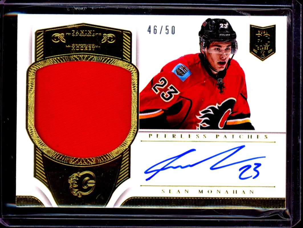 The Sean Monahan 2013 Panini Rookie Anthology #PP-SMO 2013 Panini Dominion Update: Peerless Patches /50 card is 1 of 36 Sean Monahan's card variations in the 2013 Panini Rookie Anthology set being tracked by Sports Card Investor, including Purple /1, 2013 Panini Update, 2013 Panini Update:, 2013 Panini Update: Rookie Autographs, and 2013 Panini Update: Rookie Autographs Spring Expo Cracked Ice - Black.