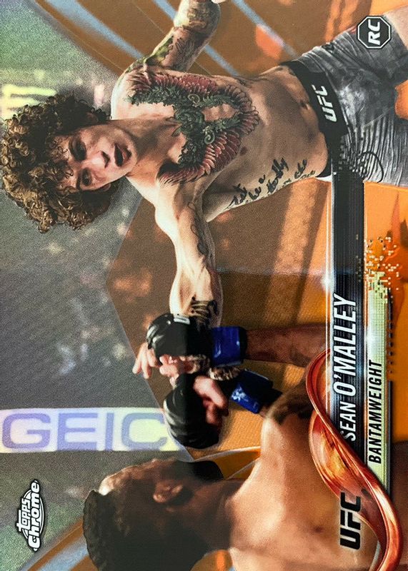 Sean O'Malley's MMA cards are available in at least 24 sets. Sean O'Malley's biggest 7-day price movers are 2024 Topps Chrome UFC #173 Speckle Refractor /299, 2018 Topps Chrome UFC #84 Orange Refractor /25, and 2023 Chronicles UFC #5 Kaboom! /(SSP).