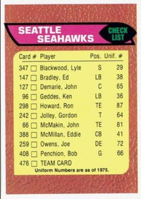 Seattle Seahawks 1976 Topps #476 Team Checklist RAW Price Guide