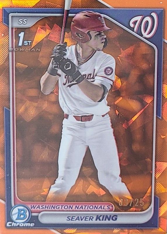 This card is 1 of 50 Seaver King's card variations in the 2024 Bowman Draft set being tracked by Sports Card Investor, including Chrome (1st), Chrome - Bubble Gum (1st), Chrome - Lunar Glow Refractor (1st), Chrome - Peanuts (1st), and Chrome - Pearl Refractor (1st).