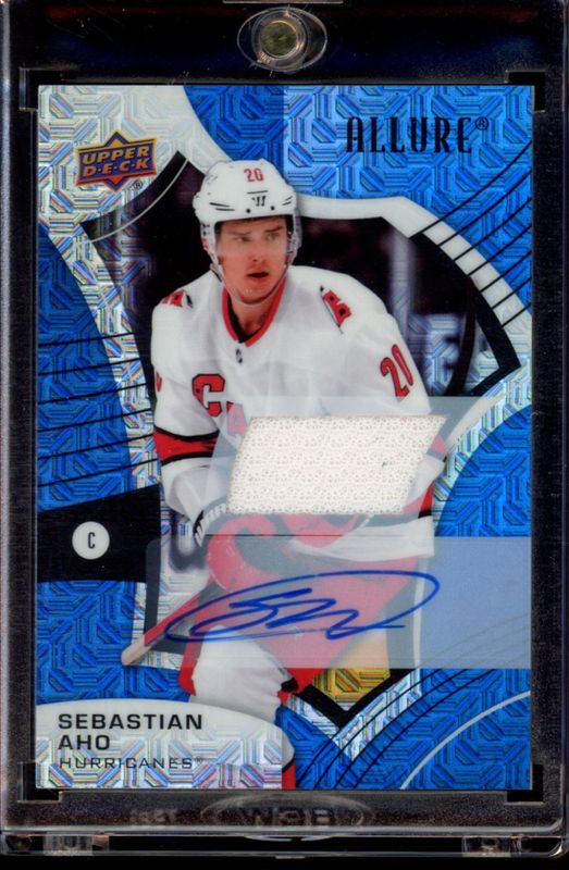 Sebastian Aho 2021 Upper Deck Allure #11 Auto Mem - Blue Line /75 RAW Price Guide