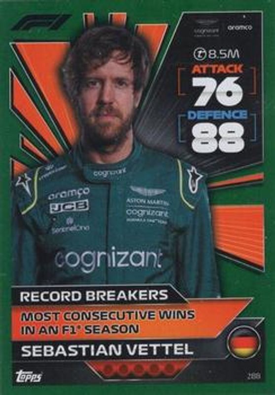 The Sebastian Vettel 2022 Topps Turbo Attax Formula 1 #288 Mirror Foil Green /500 card is 1 of 41 Sebastian Vettel's card variations in the 2022 Topps Turbo Attax Formula 1 set being tracked by Sports Card Investor, including #311 Base, #258 Base, #264 Base, #281 Base, and #284 Base.