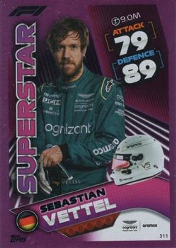 The Sebastian Vettel 2022 Topps Turbo Attax Formula 1 #311 Mirror Foil Pink card is 1 of 41 Sebastian Vettel's card variations in the 2022 Topps Turbo Attax Formula 1 set being tracked by Sports Card Investor, including #311 Base, #258 Base, #264 Base, #281 Base, and #284 Base.
