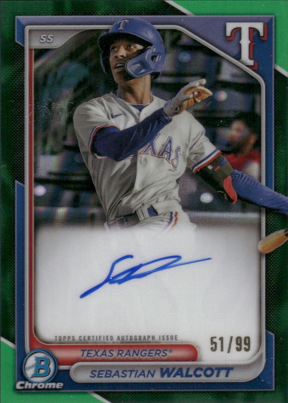 The Sebastian Walcott 2024 Bowman #CPA-SW Chrome Prospect Auto - Green Lava Refractor /99 card in Raw condition has not changed in price in the last 30 days and was last sold for $162.09 .