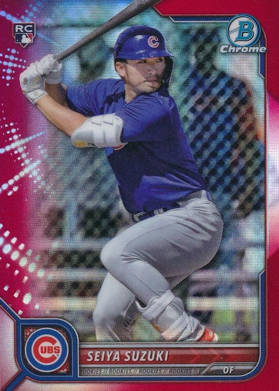 This card is 1 of 13 Seiya Suzuki's card variations in the 2022 Bowman Chrome set being tracked by Sports Card Investor, including Base, Refractor /499, Fuchsia Refractor /299, Purple Refractor /250, and Aqua RayWave Refractor /199.