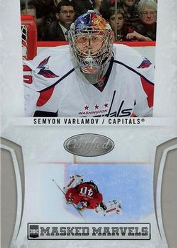 The Semyon Varlamov 2010 Certified #2 Masked Marvels /500 card is 1 of 42 Semyon Varlamov's card variations in the 2010 Certified set being tracked by Sports Card Investor, including Base /799, Platinum Red /999, Platinum Blue /250, Mirror Red Materials Dual /150, and Mirror Blue Materials /100.
