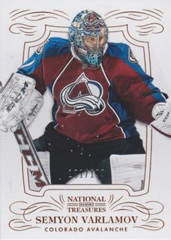 The Semyon Varlamov 2013 National Treasures #38 Base /99 card is 1 of 32 Semyon Varlamov's card variations in the 2013 National Treasures set being tracked by Sports Card Investor, including Gold /25, Silver /25, Emerald /5, Black /1, and Printing Plates Black /1.