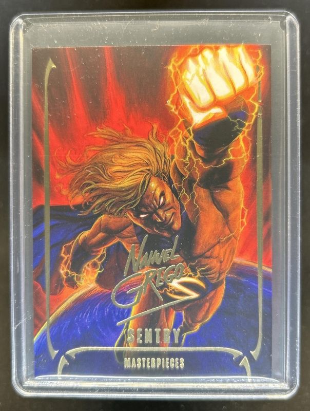 The Sentry 2024 Upper Deck Marvel Masterpieces Nahuel Grego #61 Gold Signatures Series card is 1 of 26 Sentry's card variations in the 2024 Upper Deck Marvel Masterpieces Nahuel Grego set being tracked by Sports Card Investor, including Base /1999, Gold Foil, Preliminary Art, Variant Cover /1499, and Epic Purple Foil /199.
