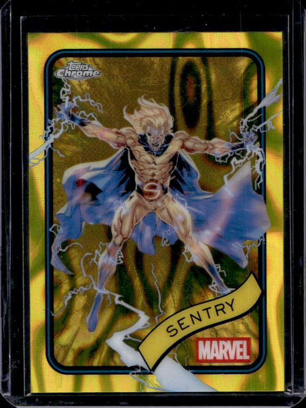 The Sentry 2025 Topps Chrome #168 Yellow Lava Refractor card is 1 of 29 Sentry's card variations in the 2025 Topps Chrome set being tracked by Sports Card Investor, including Base, Refractor, Spider Web Refractor /399, Blue Refractor /299, and Blue & Green Shimmer Refractor /199.