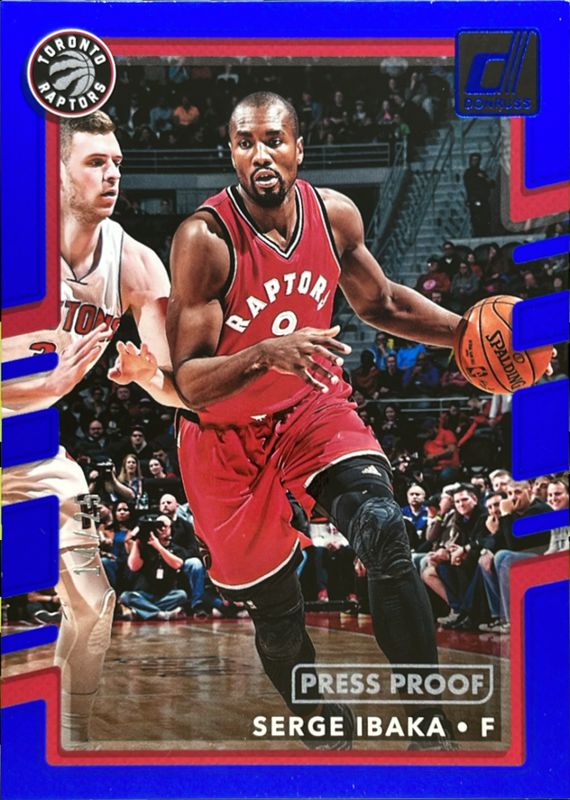 The Serge Ibaka 2017 Donruss #137 Press Proof Blue /25 card is 1 of 16 Serge Ibaka's card variations in the 2017 Donruss set being tracked by Sports Card Investor, including Base, Green Flood, Holo Green & Yellow Laser, Holo Orange Laser, and Press Proof Silver /299.