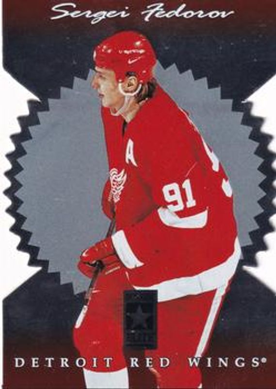 The Sergei Fedorov 1996 Donruss Elite #9 Die-Cut card is 1 of 3 Sergei Fedorov's card variations in the 1996 Donruss Elite set being tracked by Sports Card Investor, including Base, and Status /750.