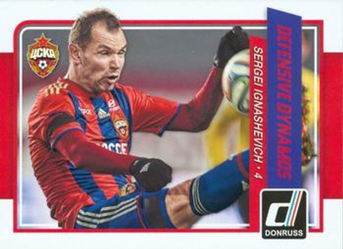 The Sergei Ignashevich 2015 Donruss #9 Defensive Dynamos card is 1 of 16 Sergei Ignashevich's card variations in the 2015 Donruss set being tracked by Sports Card Investor, including Base, Bronze Press Proof /299, Silver Press Proof /199, Gold Press Proof /99, and Red Soccer Ball /49.