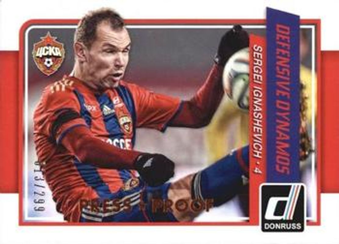 The Sergei Ignashevich 2015 Donruss #9 Defensive Dynamos Bronze Press Proof /299 card is 1 of 16 Sergei Ignashevich's card variations in the 2015 Donruss set being tracked by Sports Card Investor, including Base, Bronze Press Proof /299, Silver Press Proof /199, Gold Press Proof /99, and Red Soccer Ball /49.